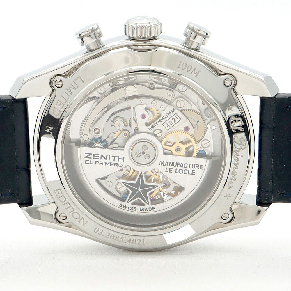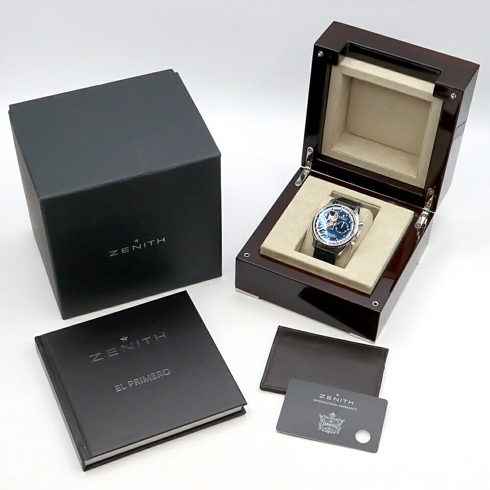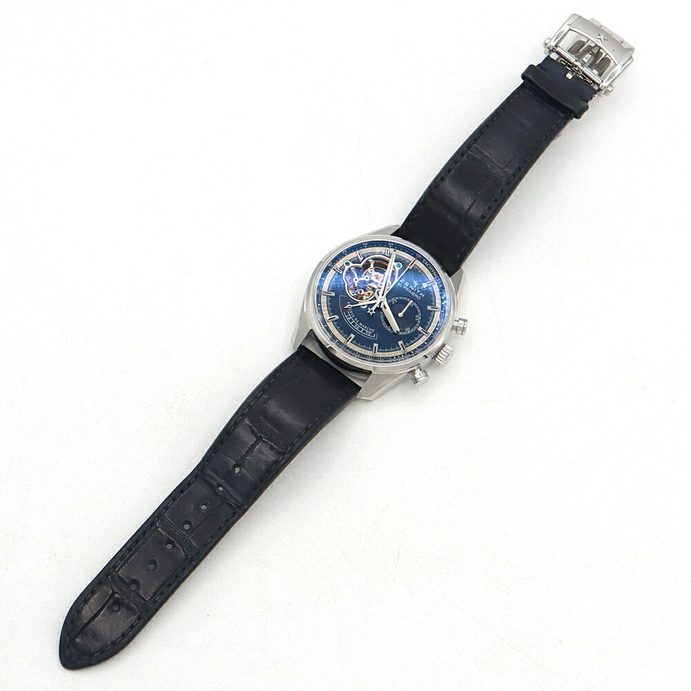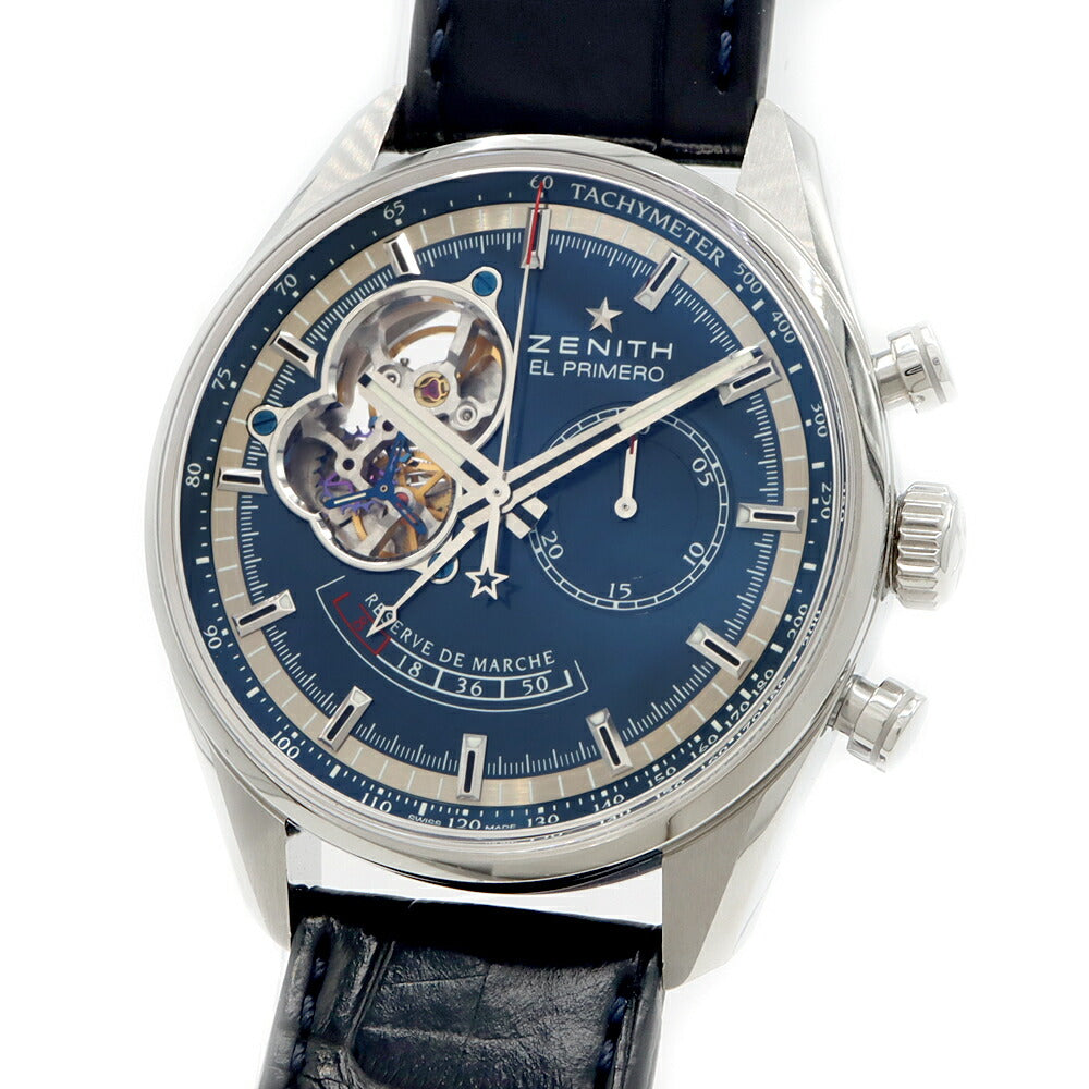 内部点検済 ZENITH ゼニス エルプリメロ クロノマスター オープン パワーリザーブ トリビュート シャルル ベルモ 限定1975本 03.2085.4021 クロノグラフ 100m防水 青 ブルー SS ステンレス 純正ベルト 純正尾錠 メンズ 自動巻き【6ヶ月保証】【腕時計】【中古】