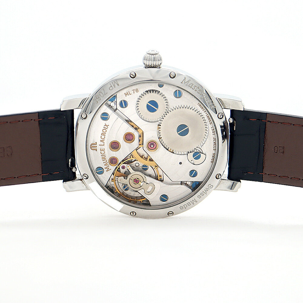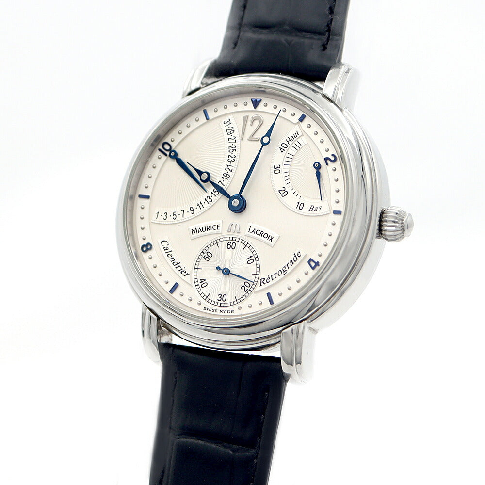 内部点検済 MAURICE LACROIX モーリスラクロア マスターピース カランドリエ レトログラード MP7068 デイト 30m防水 裏スケ 白 ホワイト SS ステンレス 純正尾錠 メンズ 手巻き【6ヶ月保証】【腕時計】【中古】