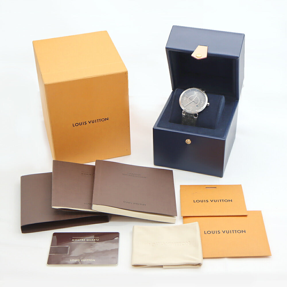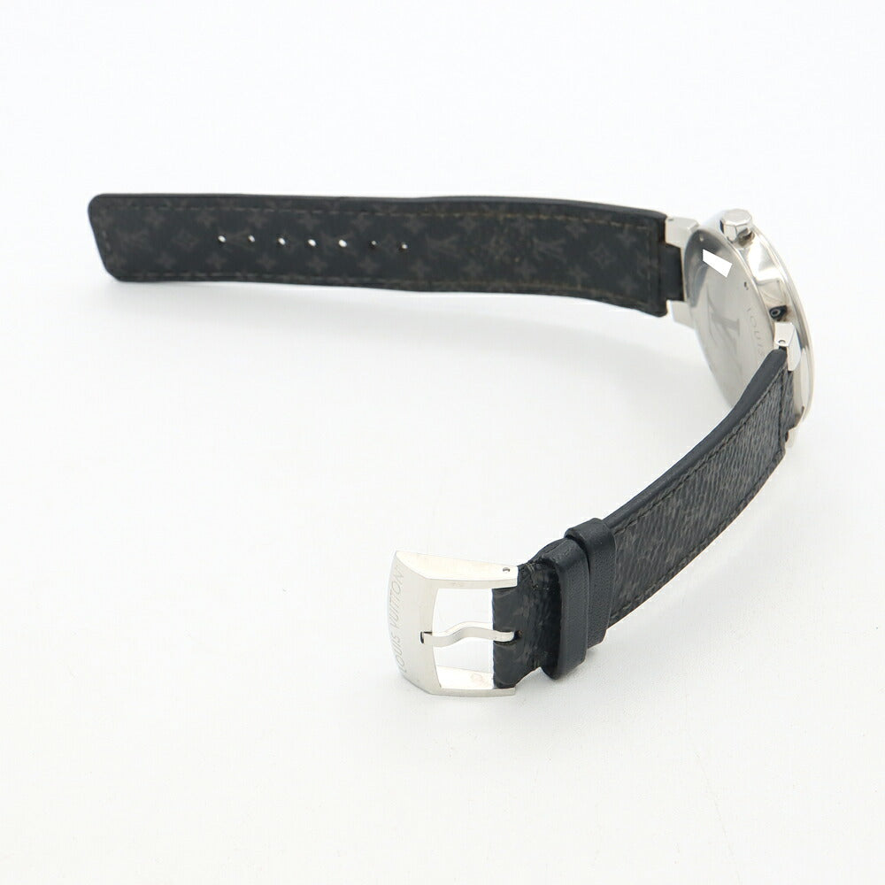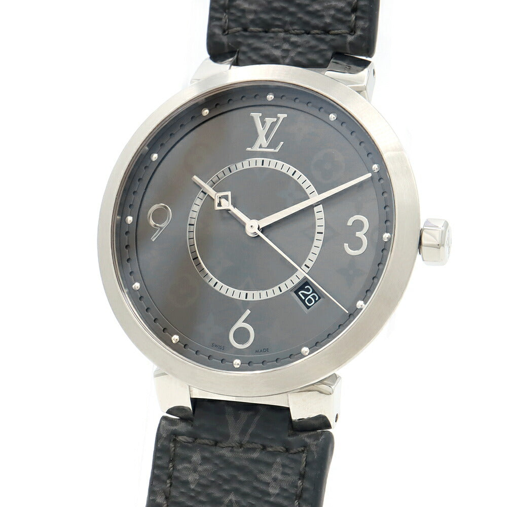 電池交換済 LOUIS VUITTON ルイヴィトン タンブール スリム エクリプス GM モノグラム Q1DM00 デイト 50m防水 グレー SS ステンレス 純正ベルト 純正尾錠 メンズ クォーツ【6ヶ月保証】【腕時計】【中古】