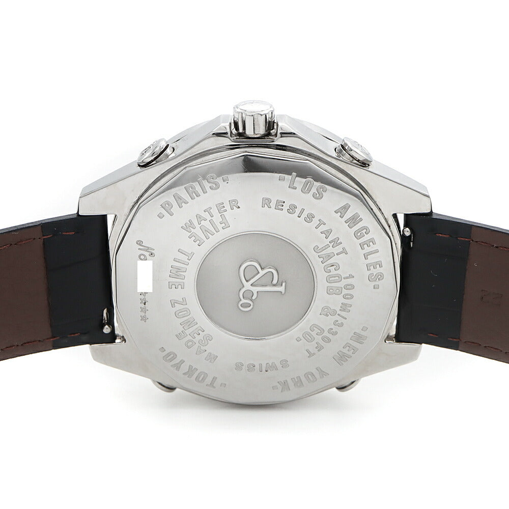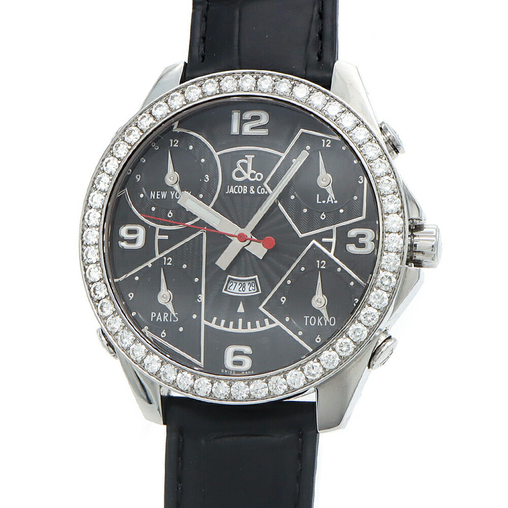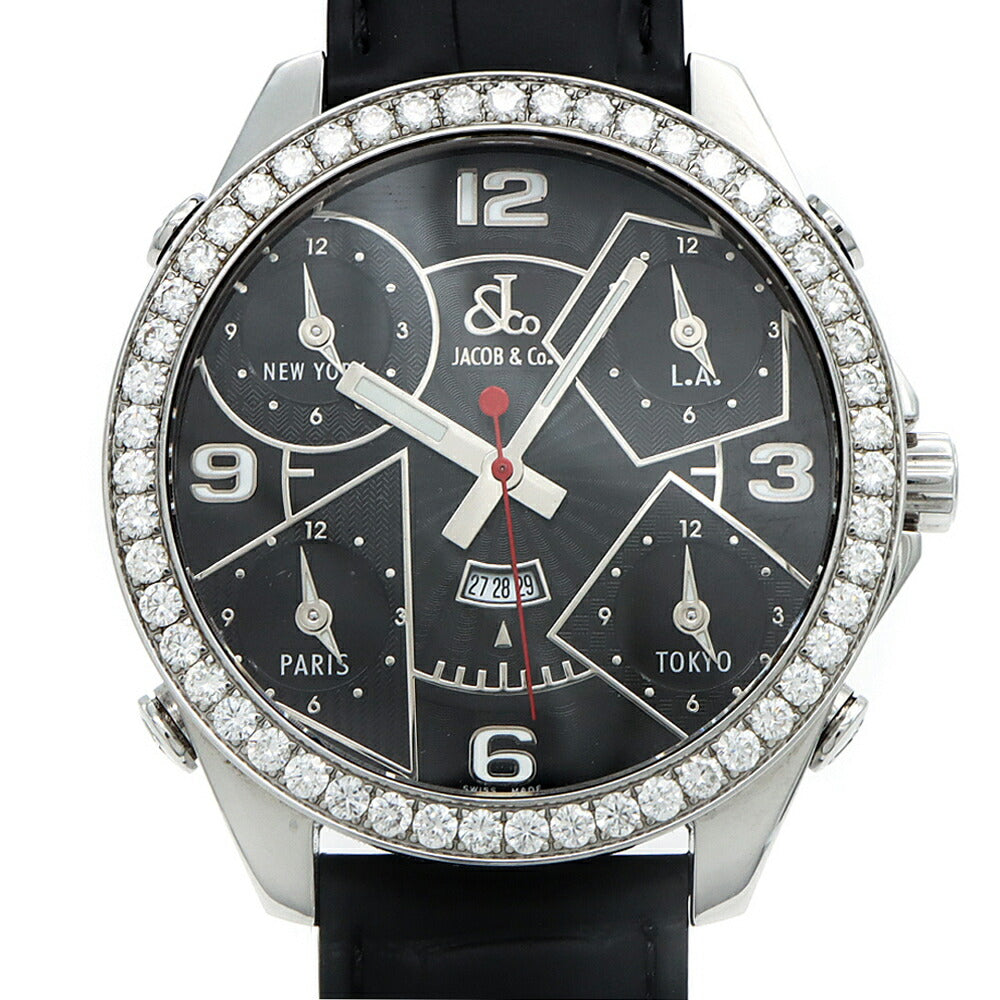 電池交換済 JACOB&Co. ジェイコブ ファイブタイムゾーン ダイヤモンド ダイヤベゼル デイト 100m防水 黒 ブラック SS ステンレス 純正尾錠 メンズ クォーツ 5タイム【6ヶ月保証】【腕時計】【中古】